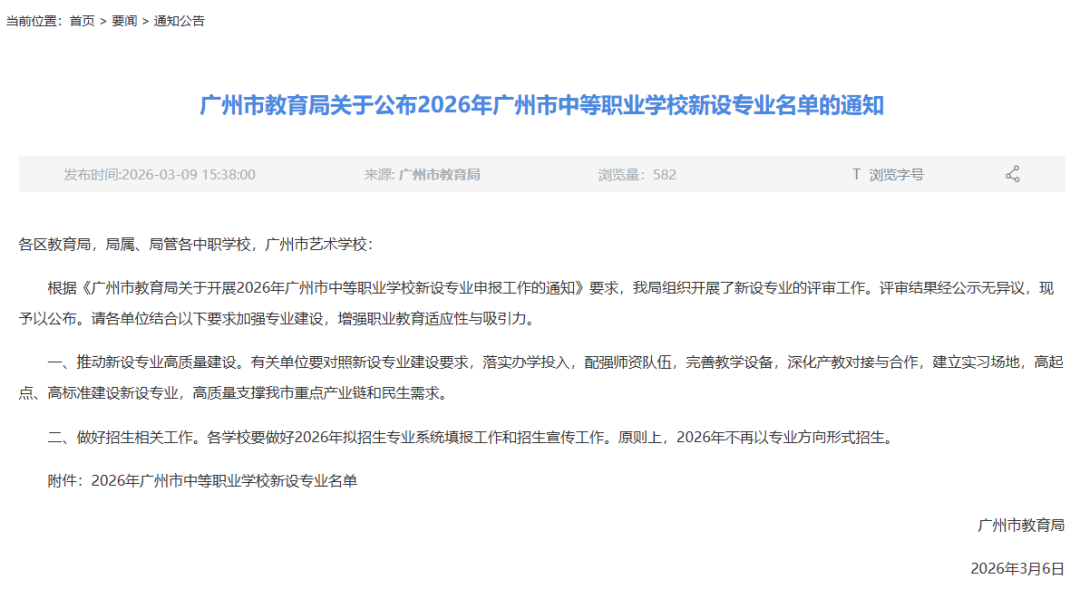 广州市教育局在通知中表示,有关单位要对照新设专业建设要求,落实办学投入,配强师资队伍,完善教学设备,深化产教对接与合作,建立实习场地,高起点、高标准建设新设专业,高质量支撑广州市重点产业链和民生需求。各学校要做好2026年拟招生专业系统填报工作和招生宣传工作。原则上,2026年不再以专业方向形式招生。