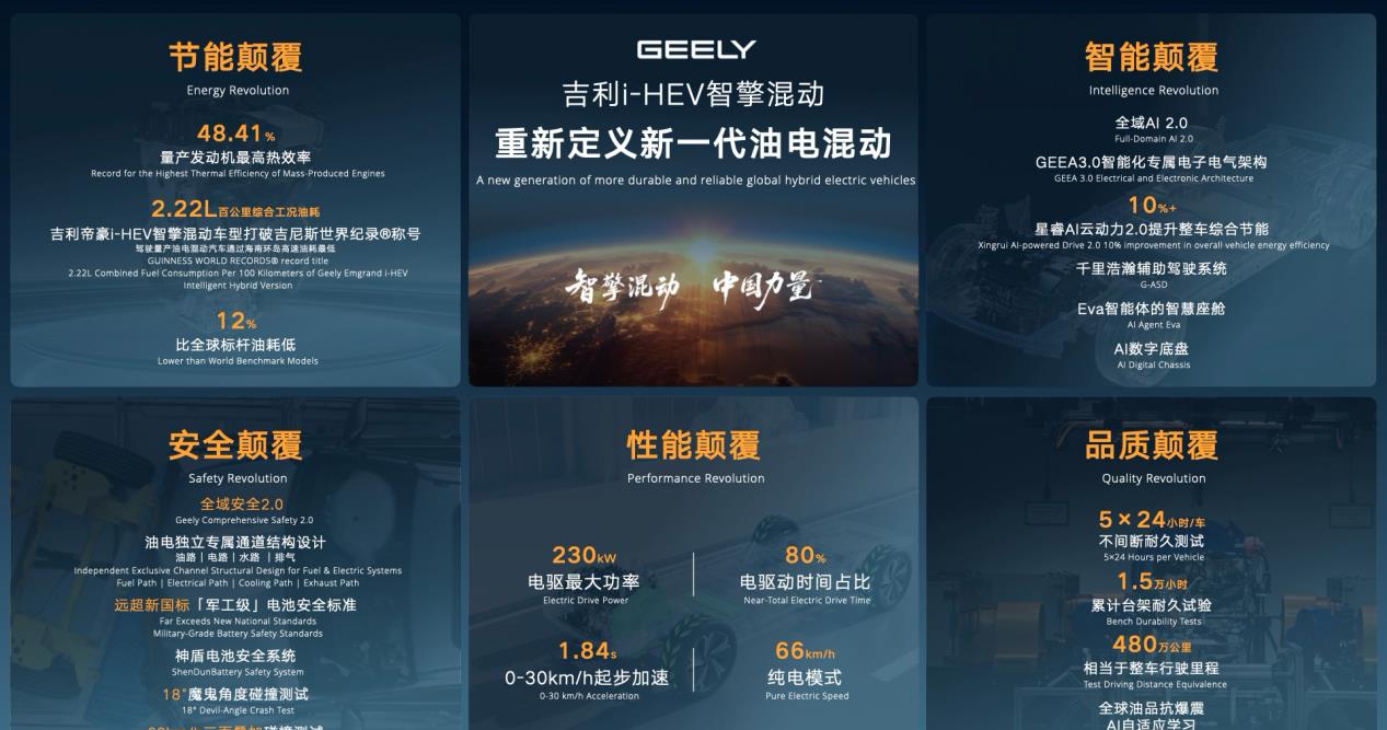 2.0赋能下,搭载星睿AI云动力2.0大模型,发动机热效率达48.41%全球第一,帝豪i-HEV实测百公里油耗仅2.22L,创吉尼斯纪录。