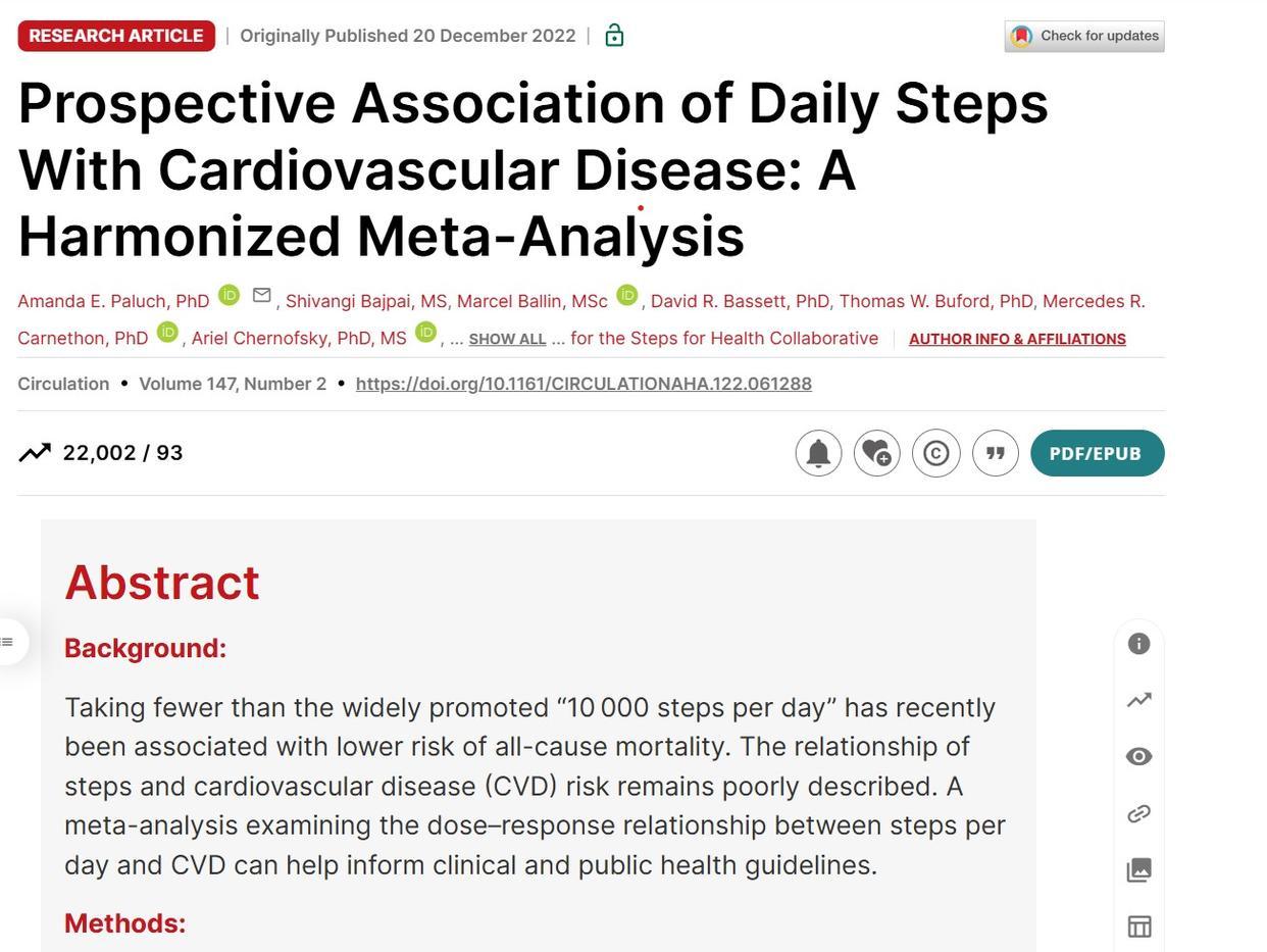 这项研究是由阿曼达·帕鲁奇(Amanda Paluch)博士及其领导的“步数健康协作组织(Steps for Health Collaborative)”完成的。研究结果发表在医学界最顶尖的期刊之一——《Circulation》(循环)杂志上。
