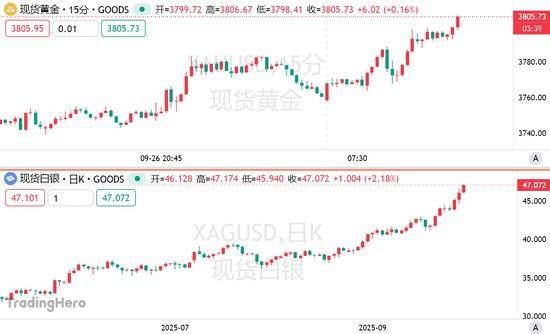 与此同时,现货白银日内大涨逾1.00美元,报47.1美元/盎司,涨幅2.2%;铂金和钯金同样强势上扬,涨势受到市场持续供应紧张及贵金属ETF资金流入的支撑。